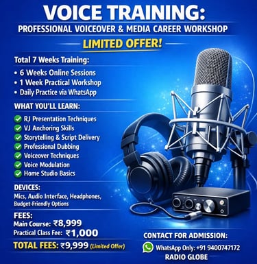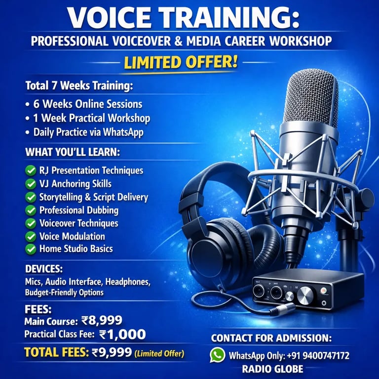 നിങ്ങളുടെ ശബ്ദത്തെ പ്രൊഫഷണലാക്കാം; മീഡിയാ രംഗത്തെ മികച്ച കരിയറിനായി ഒരുങ്ങാം."(ശബ്ദത്തിനും കരിയറിനും ഒരുപോലെ മുൻഗണന നൽകുന്നവർക്ക്)